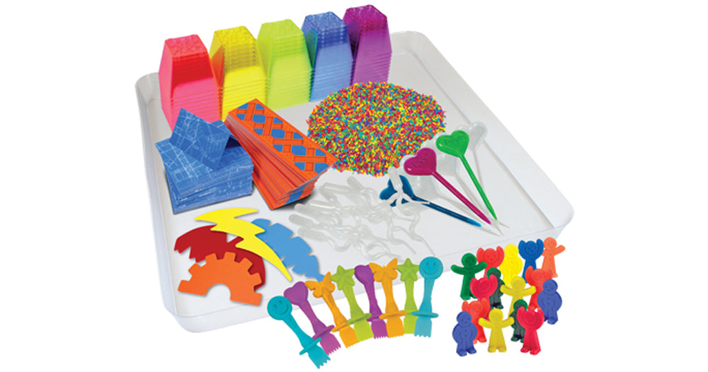 Accessory pack lets your students explore a range of activities and experiences when used with your sensory tray (sold separately). Splatter, splash and spray liquids with the squiggle pipettes. Or, use the goo spreaders to manipulate viscous substances. Set also includes building cards, super topplers, colored rice, heart pipettes and sand scraper. Teaching guide provides entertaining ways to enhance your activities with unique ideas. Accessory pack is designed for children ages 3 and up.